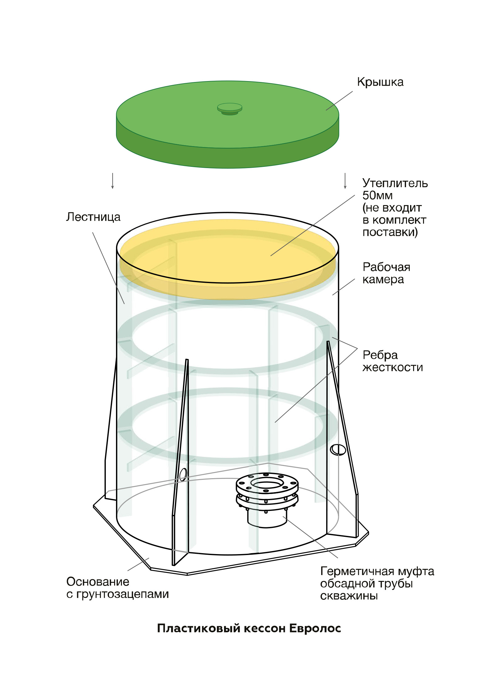 • Обсадная труба скважины. Герметизация соединения кессона с обсадной трубой скважины производится с помощью герметичной муфты Евролос.